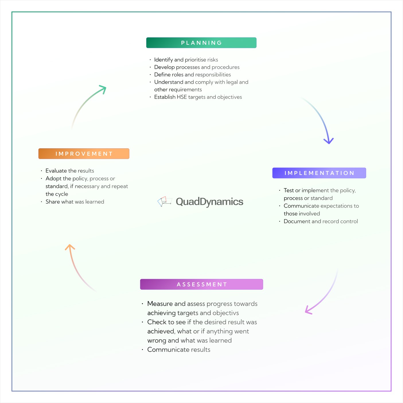 At QuadDynamics Limited, we firmly believe in the interconnectedness of Health, Safety, and Environmental stewardship. Our comprehensive approach ensures that every project we undertake is guided by these three fundamental pillars, reflecting our unwavering commitment to the wellbeing of our employees, clients, and the planet.